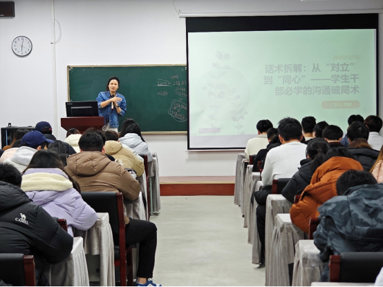 培训中,高珊老师立足学生骨干工作实际需求,结合自身多年学生工作经验,以生动鲜活的工作案例、通俗易懂的语言表达,围绕“沟通技巧”与“学生骨干工作艺术”两大核心主题展开深度分享。在沟通技巧板块,高老师系统梳理了沟通的核心原则,细致讲解了与同学日常交流、向老师汇报工作、组织协调活动等不同场景下的沟通策略,重点强调了“倾听的艺术”与“表达的逻辑”,引导骨干们在沟通中学会换位思考、真诚共情,切实提升沟通的有效性与针对性;在学生骨干工作艺术板块,高老师结合具体工作场景,从明确自身定位、树立服务意识、统筹工作任务、协调团队关系、处理突发问题等多个维度给出实用方法,鼓励骨干们在工作中既要坚守原则底线,又要注重灵活变通,以科学方法提升工作效率,以责任担当践行服务宗旨。