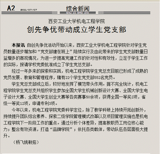 2011年7月7日,《陕西工人报》在第二版重要位置,以《永利集团88304创先争优带动成立学生党支部》为题,报道我校机电学院创先争优活动开展情况,原文如下: