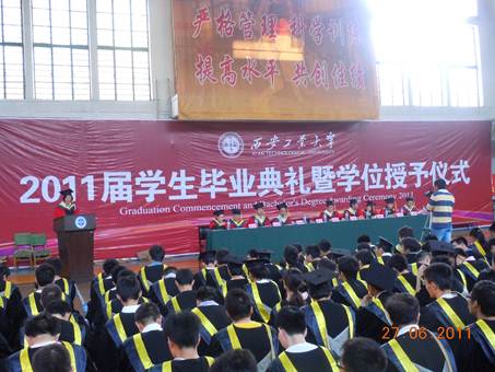 典礼在雄壮的国歌中开始。机电学院党委书记张忠宣读本届学生获2011年三好学生、优秀学生干部名单,并代表学院党政领导和广大师生员工,向圆满完成学业的毕业生表示最热烈的祝贺。她充分肯定了广大同学在校期间,勤奋苦读,勇于实践,自身素质不断提高,在学风建设和管理中起到了模范带头作用。同时祝同学们身体健康,生活愉快,再创佳绩。