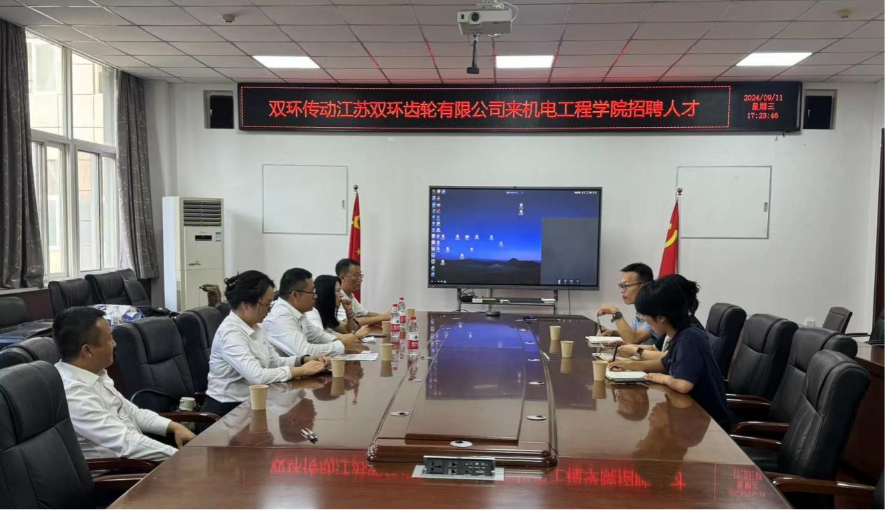 在交流环节,双方围绕职业发展、实习机会、校企合作等方面进行了深入的探讨。企业代表对招聘会上学生们展现出的专业素养和积极态度表示赞赏,并承诺将为优秀学生提供实习和就业机会。程新峰表示,非常高兴能与双环传动建立合作关系,通过校企合作,不仅能够为学生提供实践平台,还能进一步优化学院教学内容,使之更加贴合行业需求,期待未来能与双环传动在人才培养、科研合作等多个领域展开更广泛的合作。