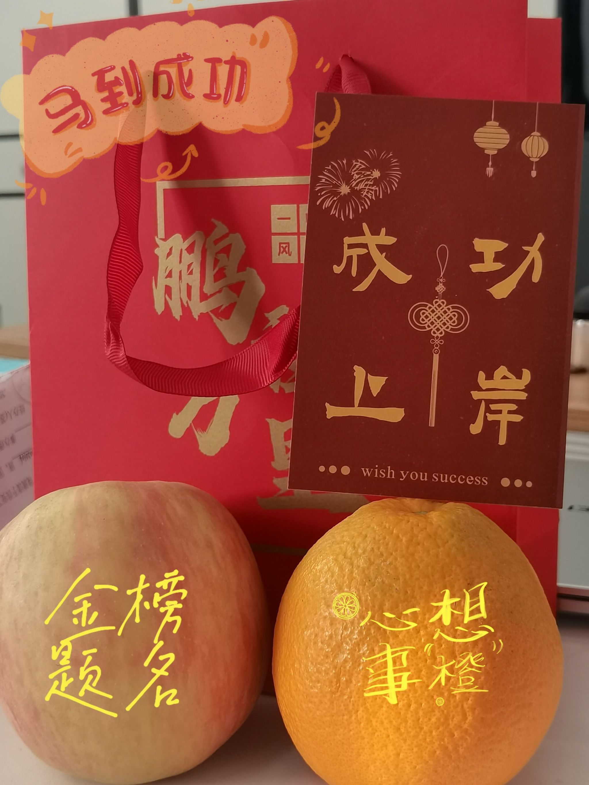 在考研礼包中,学院特意准备了鲜橙和苹果等寓意美好的食品,象征着“马到橙功”和“苹步青云”。同时,礼包中还包含了祝福语卡片和解压伴手礼,寓意着学院希望同学们在备考期间保持身心健康,精神充沛,能够以最佳的状态迎接考试。
