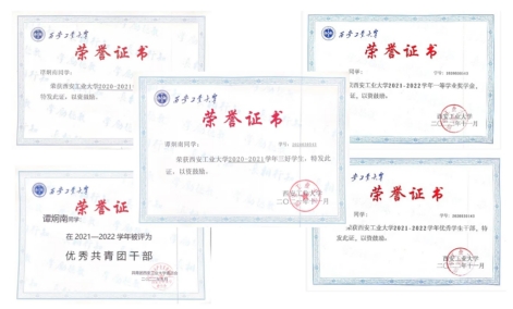 在科技竞赛方面,谭炯南多次参观科研实验室,在活动中他感受到研发、设计机器的乐趣。他主动与负责老师、辅导员沟通,积极参加各种比赛,在实验室与师长的交流学习中,他的实践思维、竞赛能力得到了迅速提高,累计获得中国机器人及人工智能大赛国家级二等奖、全国三维数字化创新设计大赛国家级二等奖、中国高校智能机器人创意大赛等国家级、省级、校级奖项20余项,个人能力全方面提高。