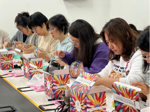 在制作过程中,大家充分发挥自己的想象力和创造力,将手中的马赛克贴片变成了一幅幅独特的艺术作品。有的以绚丽的色彩组合打造出抽象的图案,有的则精心拼接出花朵、日月等可爱的造型,每一盏台灯都蕴含着她们的巧思与匠心。现场不时传来交流和讨论的声音,大家相互分享着创意和经验,气氛十分融洽。