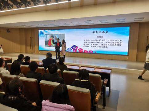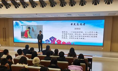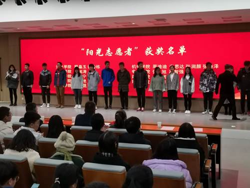 首先是最美志愿者汇报颁奖环节。起朝剑提出了他本次汇报的主题“从心开始,志愿同行”,在做了简短的自我介绍后,他呼吁在场的各位为所有置身于志愿服务的志愿者献上自己的掌声。在接下来的汇报过程中,他分别从“把平凡的事做得不平凡”“志在,愿在,我在”“与人为善、取人为善”“有意义的事情一直做”四个方面展示了他一年多来参与的志愿服务的感受,他对志愿服务的理解是:青年志愿者活动是微小的,因为有时候它涉及的范围有限。它又是伟大的,因为它在有限的范围中让人们脸上露出了笑容,让人们感受到了社会的温暖。加入志愿者的我们虽然很平凡,却很幸运。可能会辛苦,但也很快乐,同时也是我们沟通的彩虹,是交流的桥梁,我们用生命影响生命,我们是快乐的志愿者。他的汇报生动形象、充满真情实感,赢得了在场观众的阵阵掌声。汇报最后,他用“有困难,找志愿者;有时间,做志愿者”的朴实语言,呼吁在座的所有人积极投身于志愿服务之中,为我校志愿服务工作做出自己的贡献,积极投身于构建和谐社会的时代责任之中。第二环节是阳光志愿者颁奖,周迪迪、张润颜、张垂泽、李思达同学随同所有“阳光志愿者”荣誉称号获得者,登上舞台并合影留念。正是因为有了他们为学校、为社会的无私奉献,才有了今天被授予的荣誉。他们的志愿服务精神,也将一直延续下去。