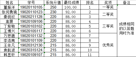 活动伊始,工作人员提醒全部参赛学生进入问卷星小程序进行赛前准备,同时在活动群中介绍了本次活动的目的、意义以及我国第32个保密宣传月的相关知识,并提前5分钟下发答题链接。18点50分,116名参赛选手准时在答题系统中开始答题,按照活动规则在30分钟内对对所给出的50道单选题进行作答并提交。每位选手在作答后可自查答题情况,比赛结束后系统对没有作答上来的题目都有详细的解析以供学生学习和参考,工作人员赛后第一时间对作答情况和用时进行统计并公布排名。在工作人员的共同努力和参赛选手的积极配合下,本次保密宣传月线上知识竞赛圆满完成。现将比赛结果公如下。